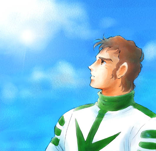 80000アクセスお礼のCGが描けなくて、それでも何か描かないと!!と描いた島くんです。 青空見上げながら、昼飯の心配する島くんってゆ~もたまには良いですよね?(^^; ***** 真剣な眼差しで透き通る青空を見上げつつ、昼飯の心配をする島さん!!! 何となくカレーを選びそうな感じです♪